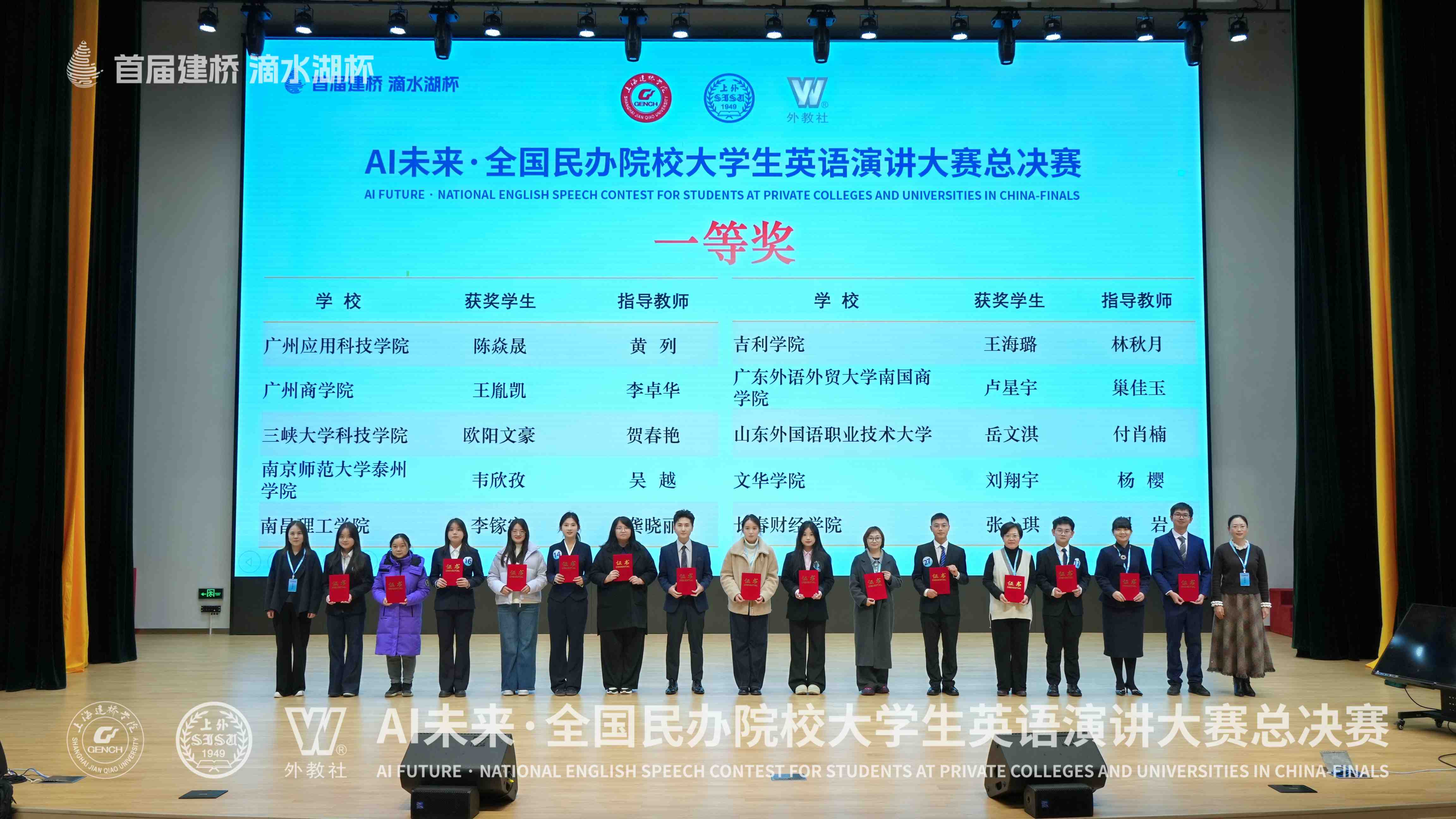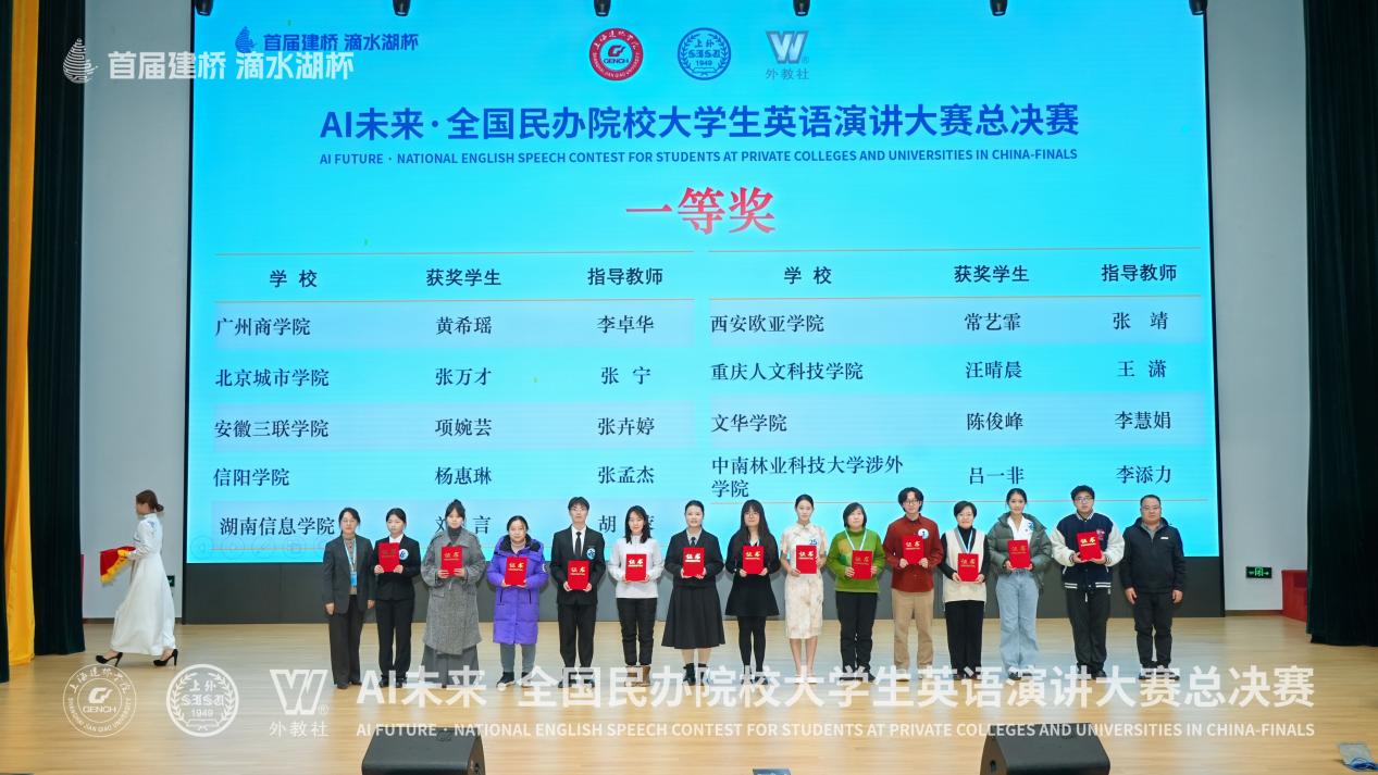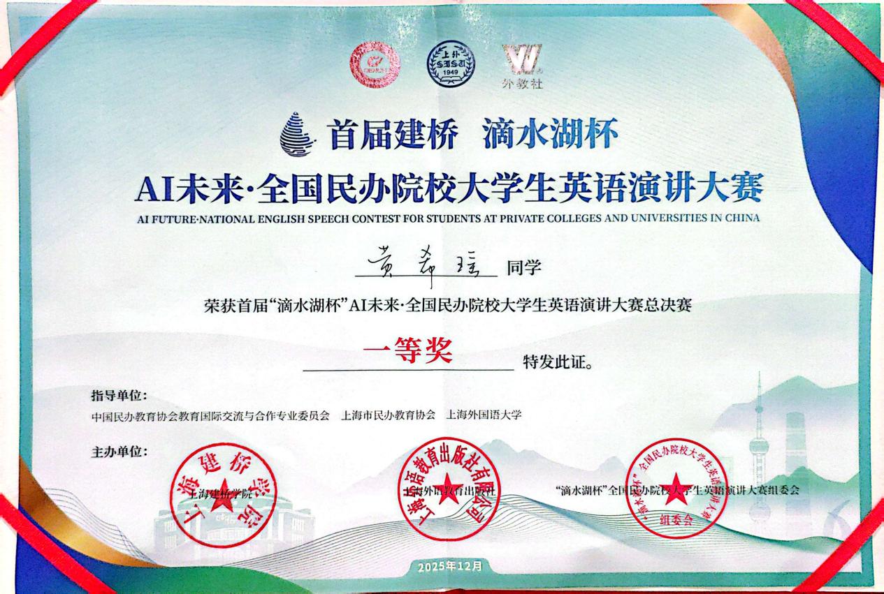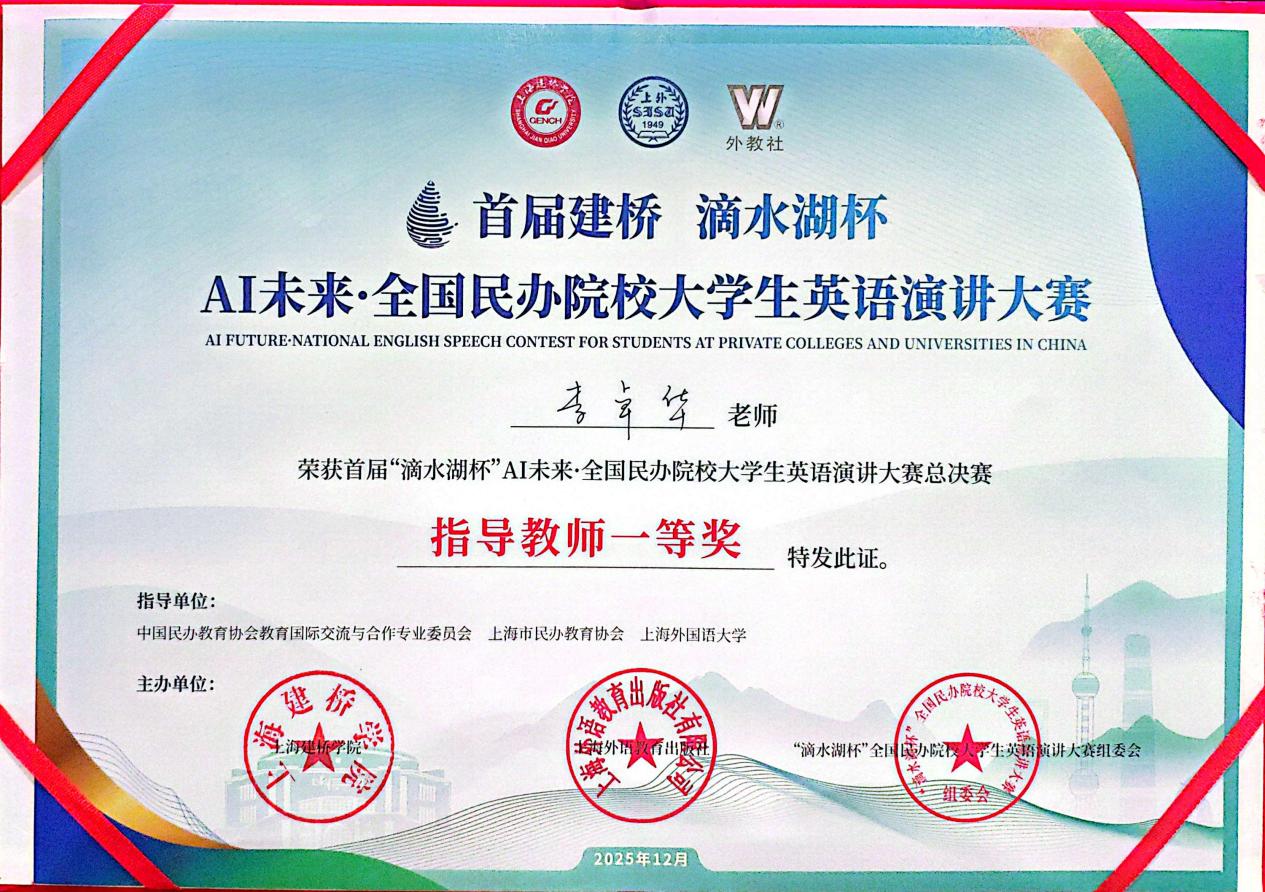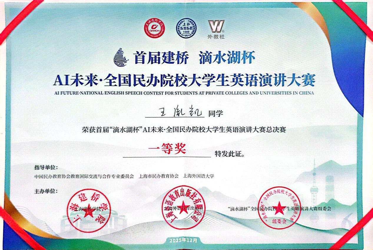 近日,“滴水湖杯”AI未来·全国民办院校大学生英语演讲总决赛在上海建桥学院圆满结束。我校外国语学院王胤凯同学、经济学院黄希瑶同学凭借出色表现双双斩获全国一等奖,外国语学院李卓华老师荣获“指导教师一等奖“。